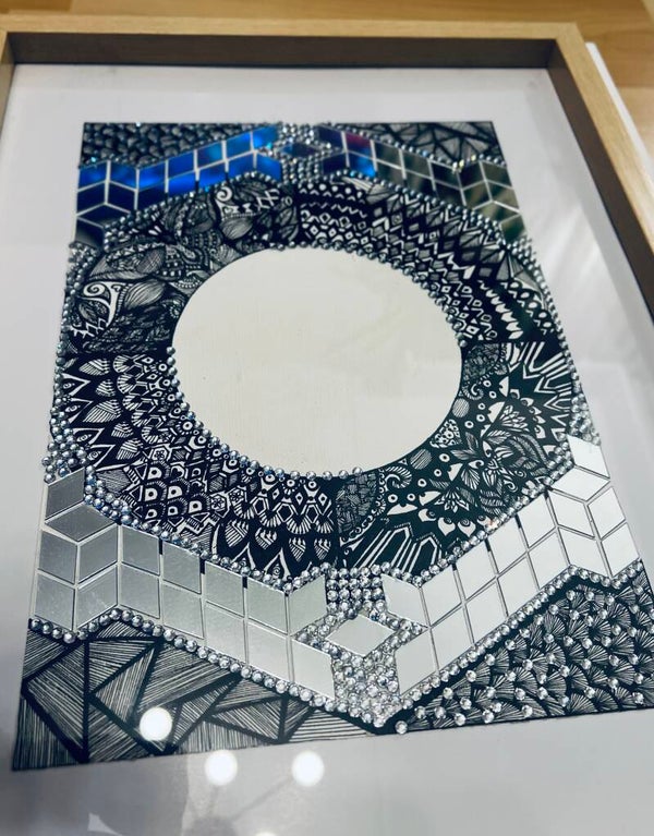 REFLECTION is a statement of individuality, craftsmanship, and modern elegance. Designed and handcrafted with precision, this decorative frame blends geometric mirrored glass, crystal detailing, and intricate monochrome artwork into a timeless piece of wall décor.
