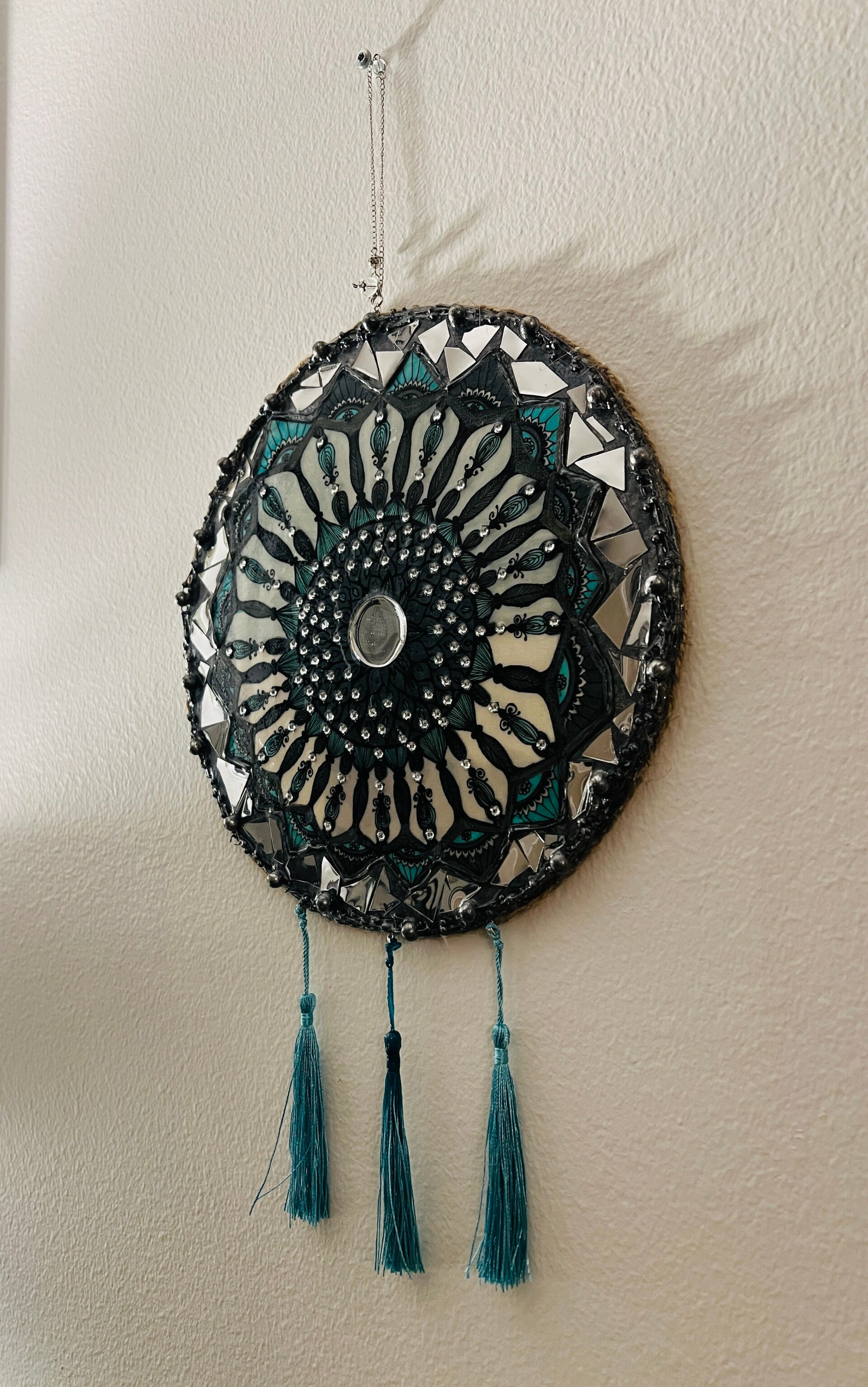Add elegance and artistic energy to your space with this handcrafted mandala wall hanging. Designed with intricate patterns, mirror accents, and decorative tassels, it creates a beautiful focal point for any room.